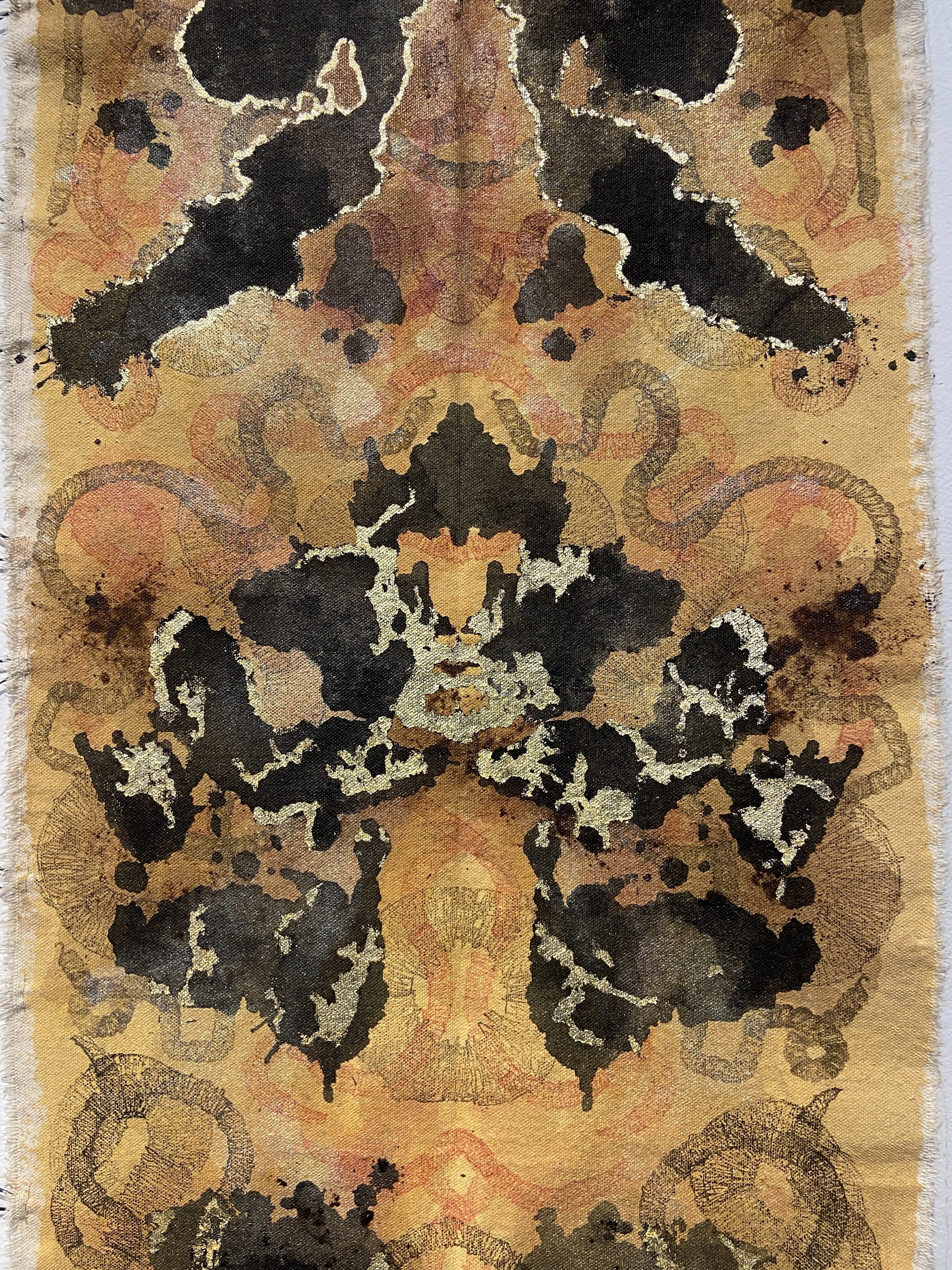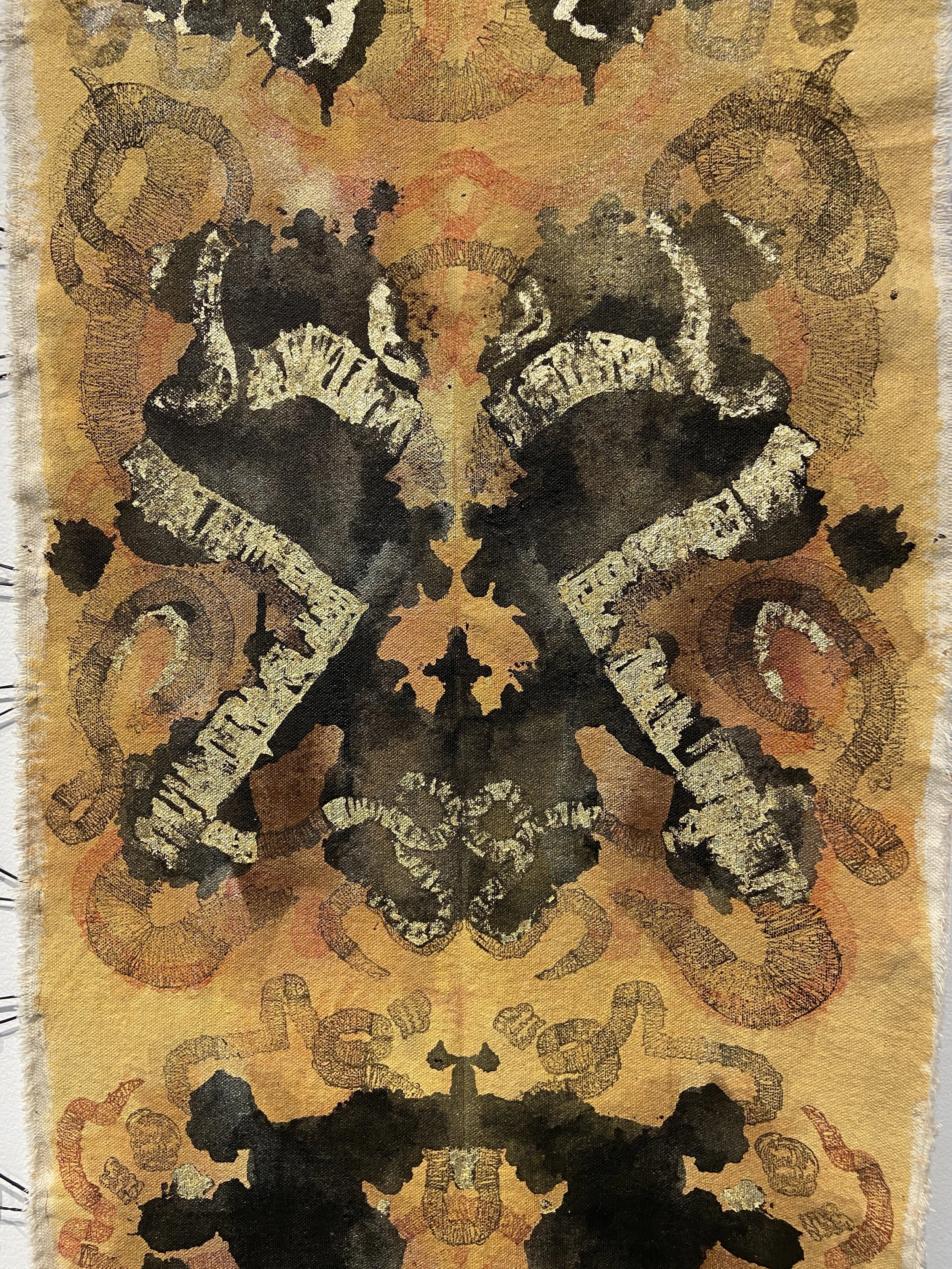 Acrylic Paint, Ink, Relief Printing, Hand Stitching, and Gold Flakes on Canvas