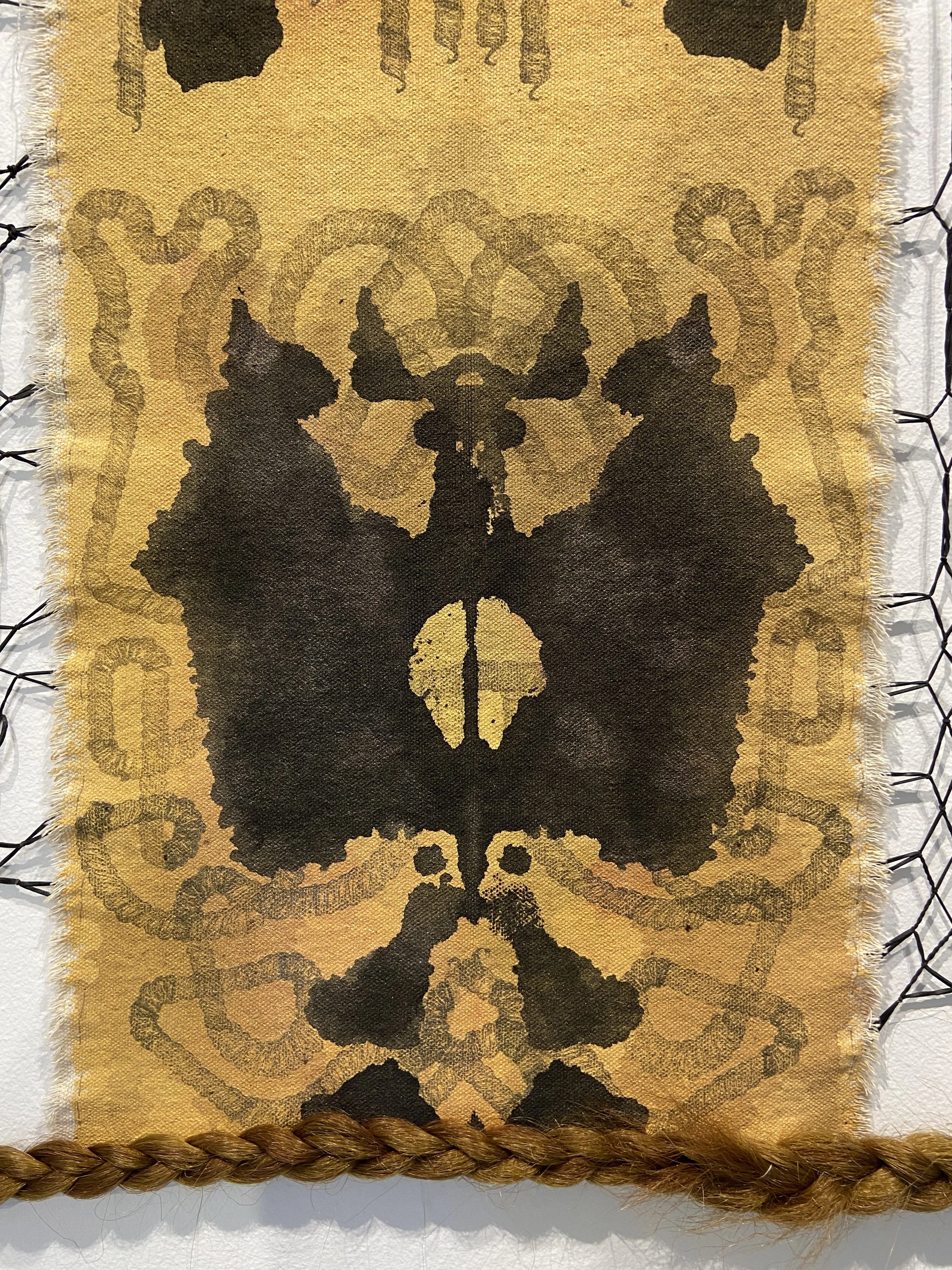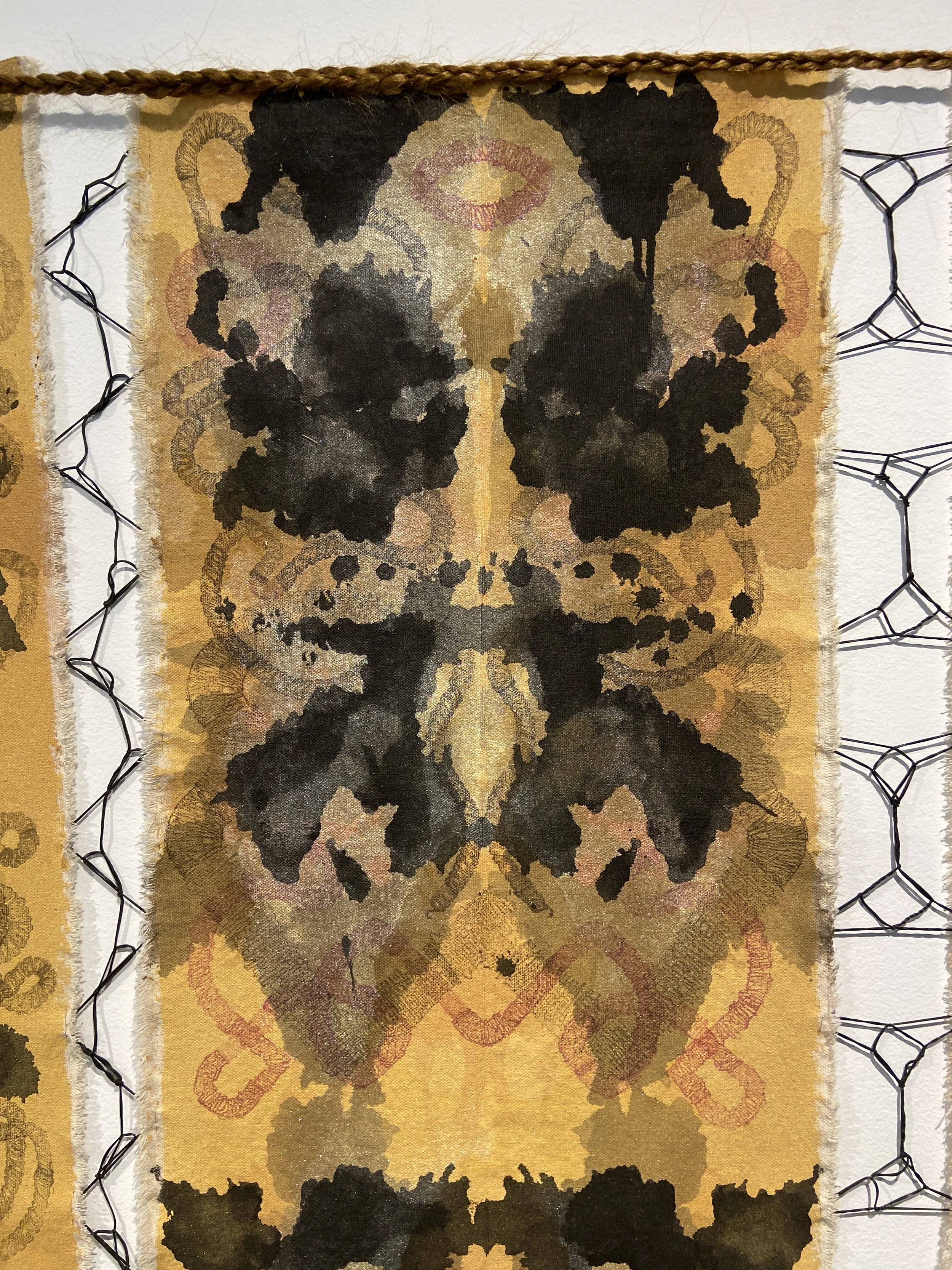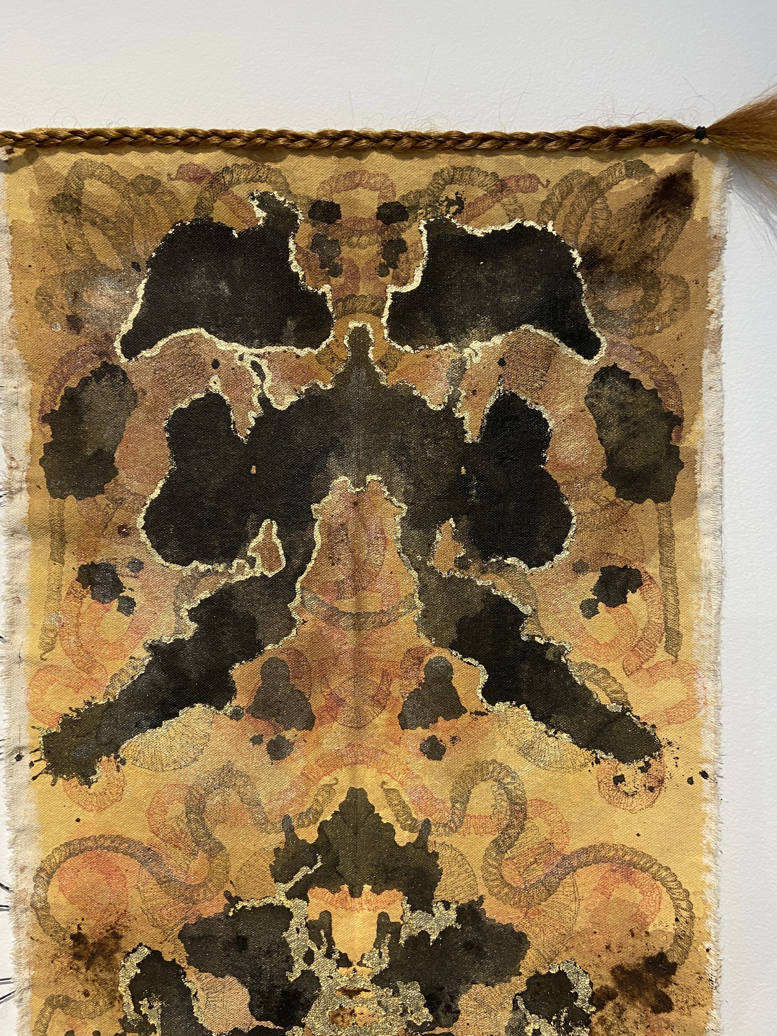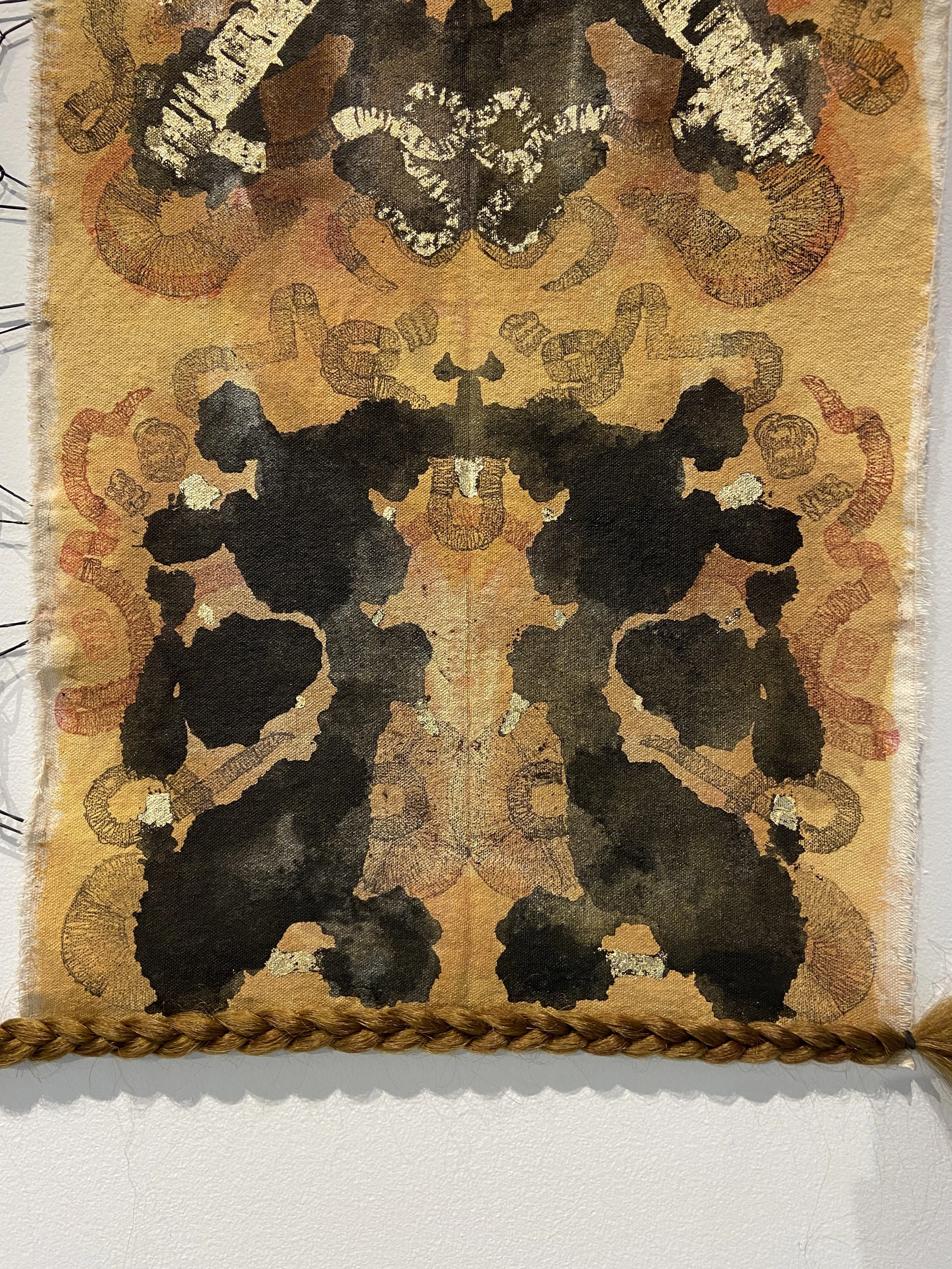 Acrylic Paint, Ink, Relief Print, Gold Flakes, Black Rubber Bands and Hair on Canvas