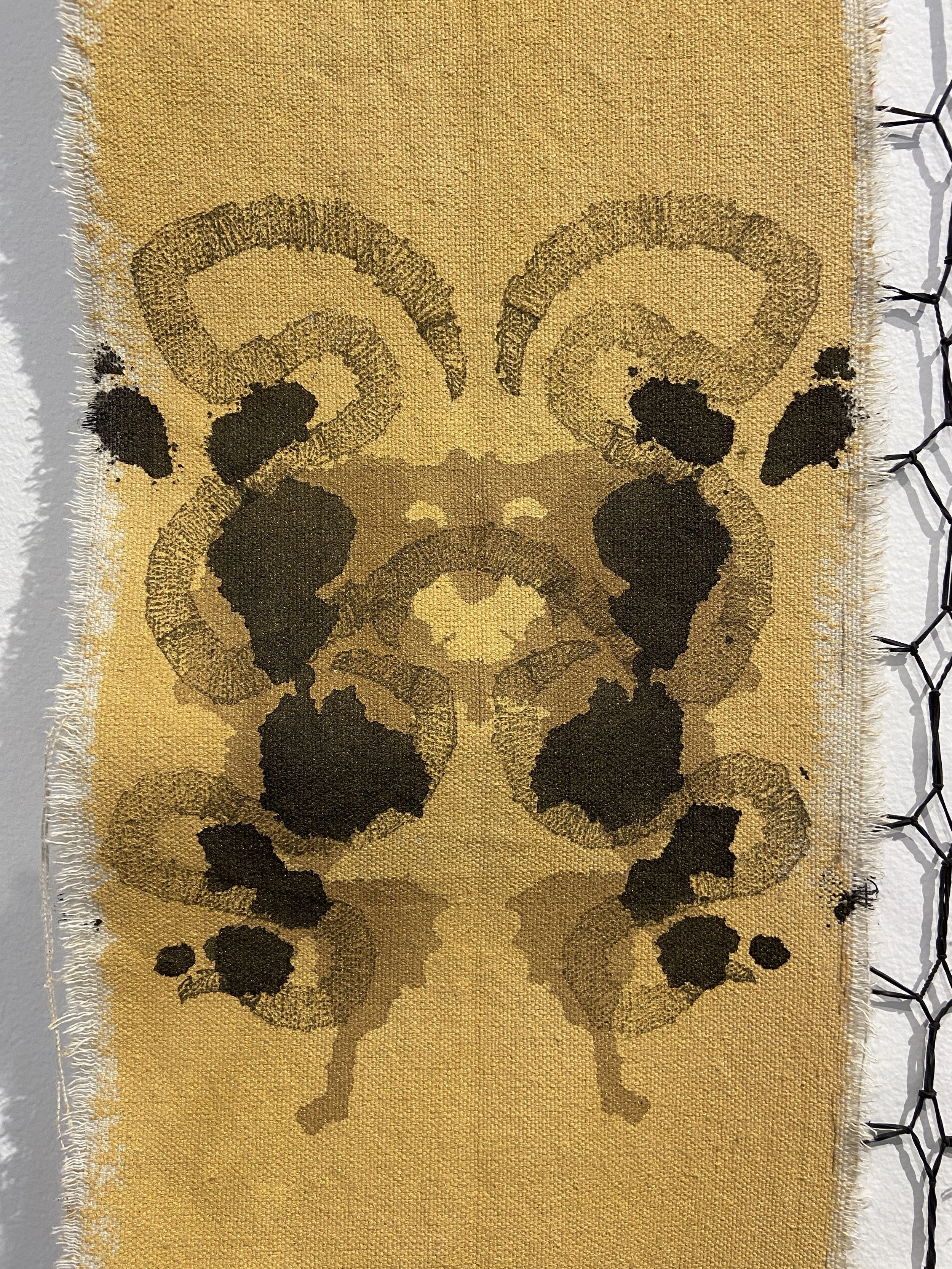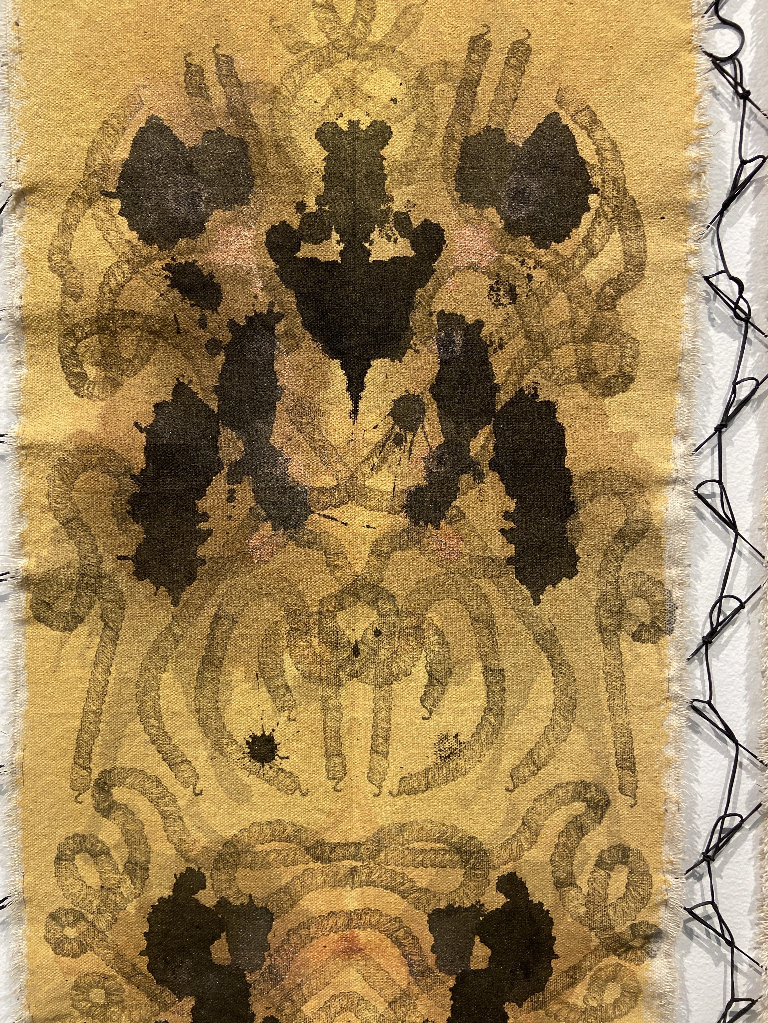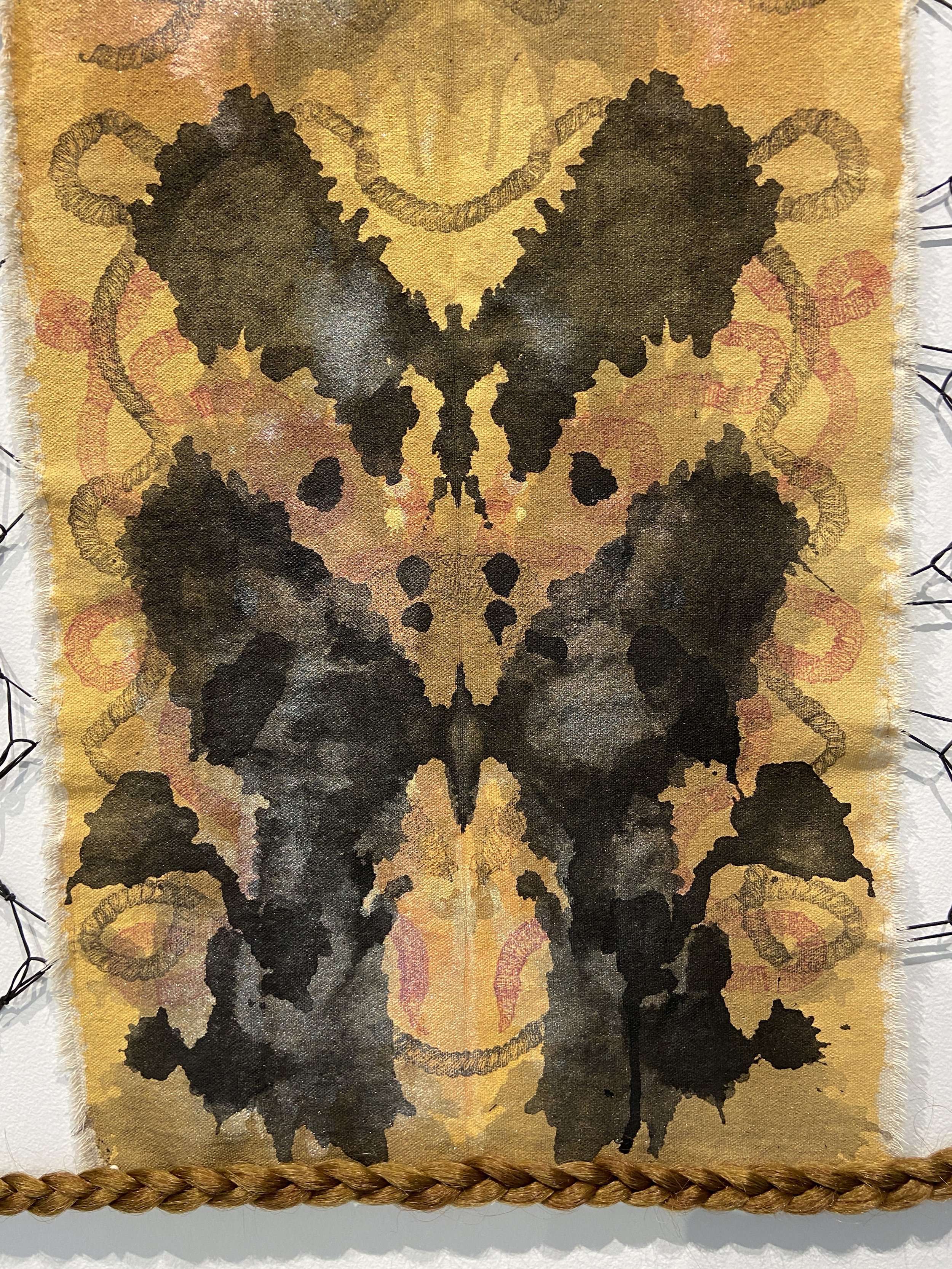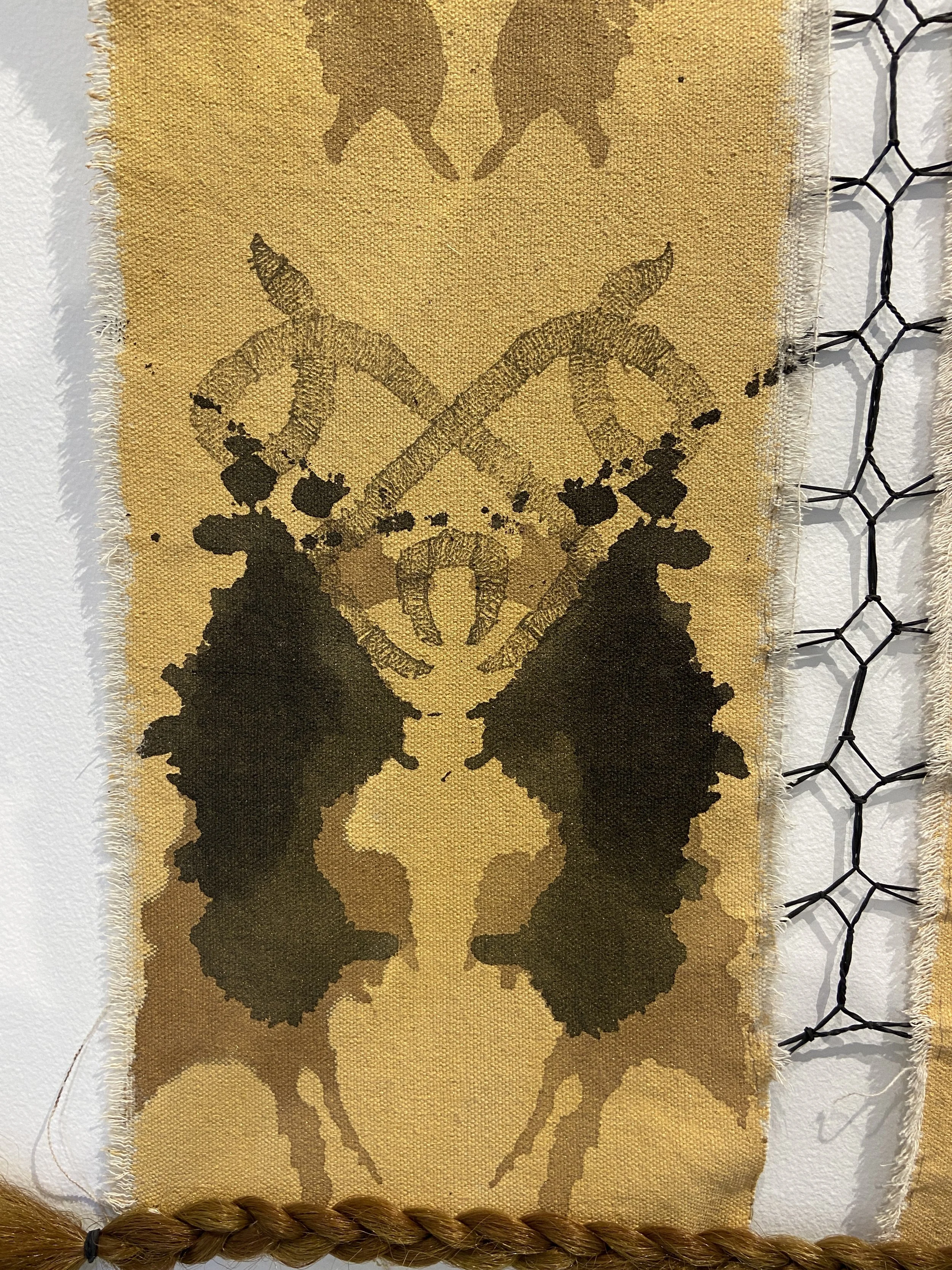 Acrylic Paint, Ink, Relief Print, Gold Flakes, Black Rubber Bands and Hair on Canvas