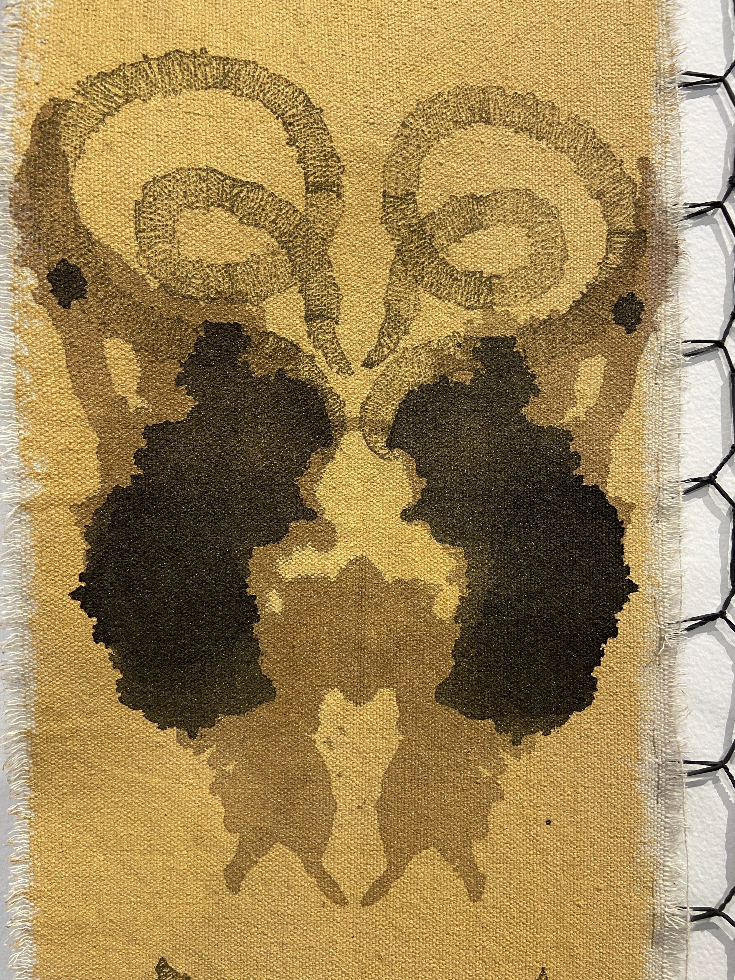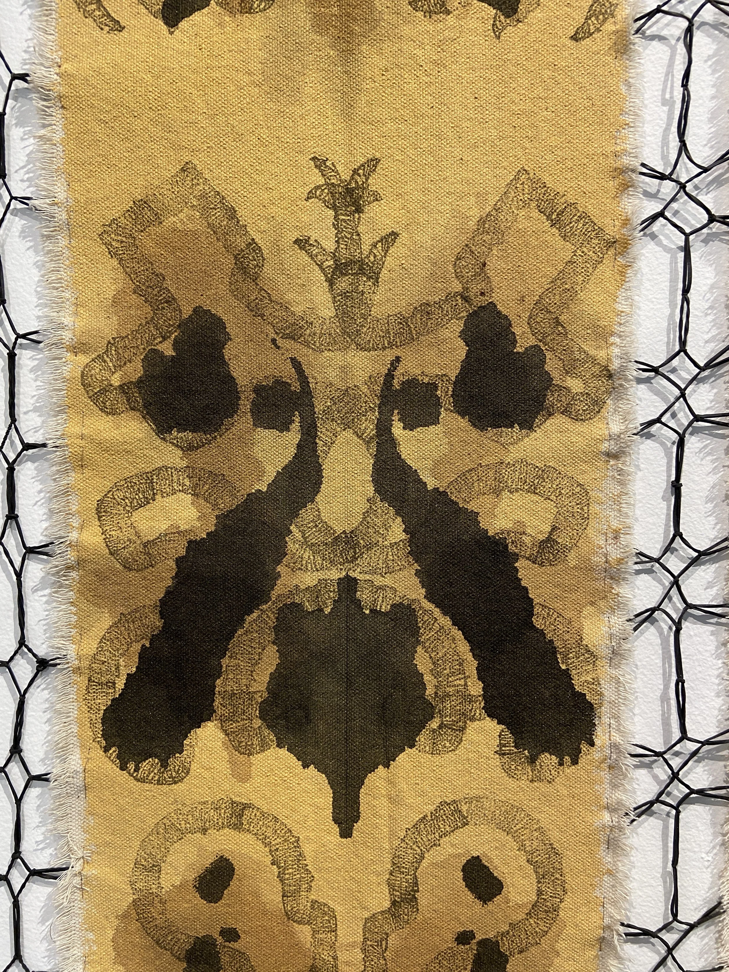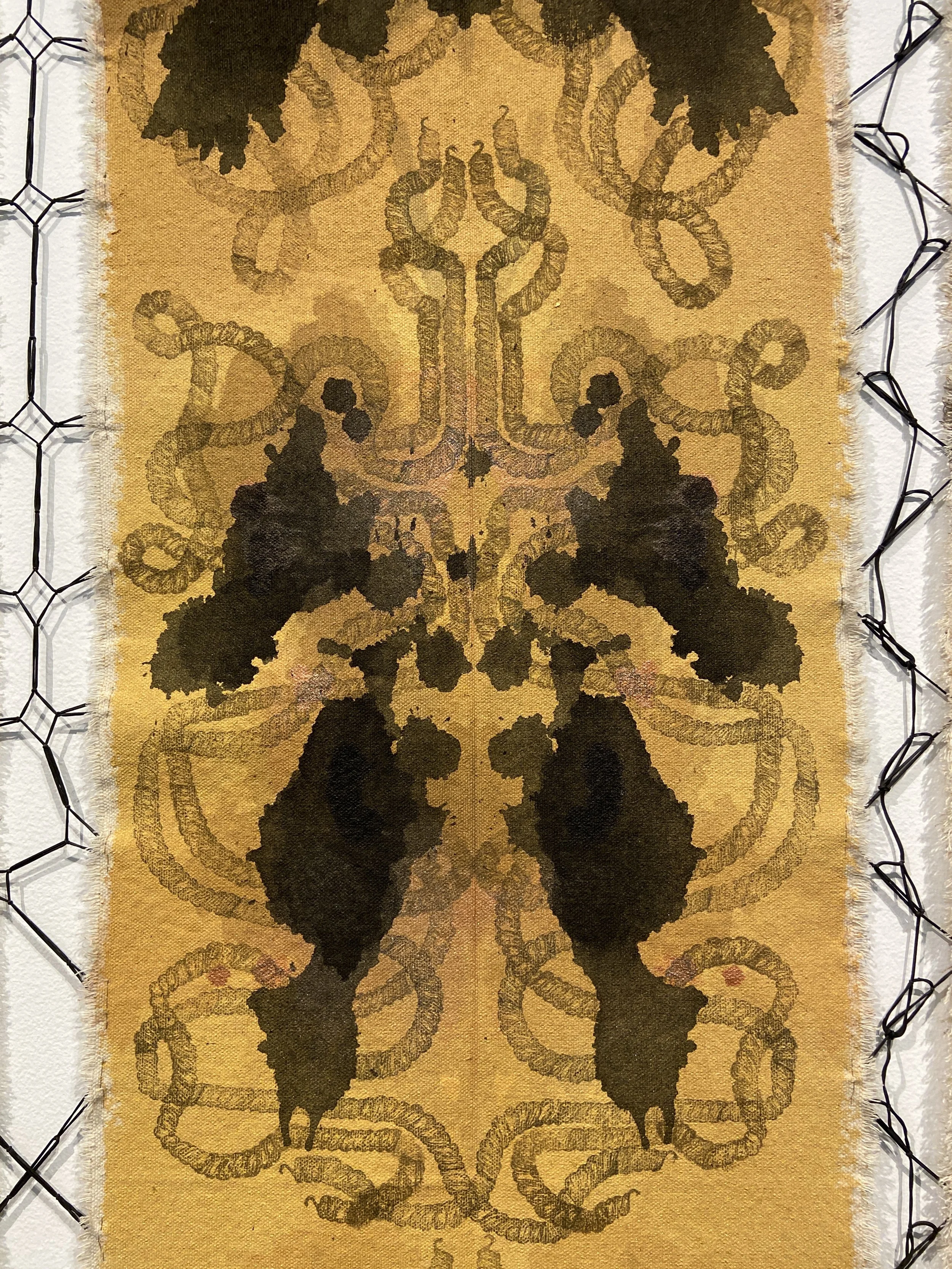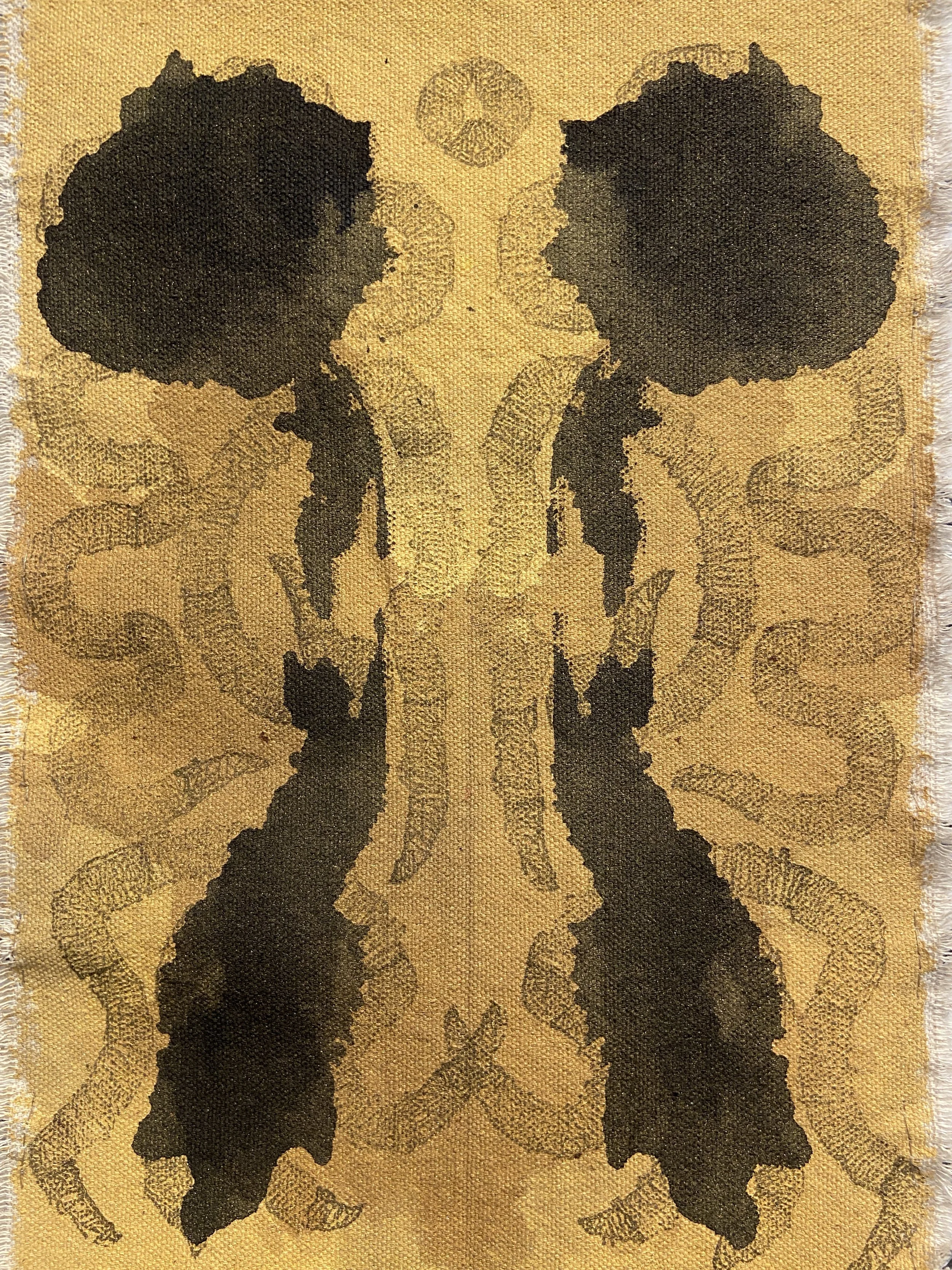 Acrylic Paint, Ink, Relief Print, Gold Flakes, Black Rubber Bands and Hair on Canvas